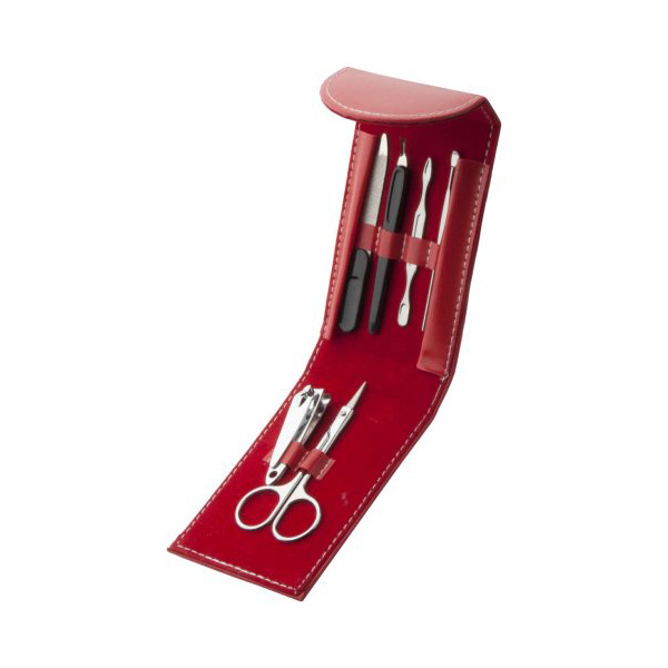 Set za manikuru SET SADRŽI: • grickalicu za nokte • škarice za nokte • rašpica za nokte • nožić za nokte • metalni pogurivač zanoktica • metalni štapić za manikuru OPIS PROIZVODA: Set za manikuru od 6 komada postavljenih u PVC torbicu s gumbom za zatvaranje. Veličina proizvoda: 120 x 70 mm